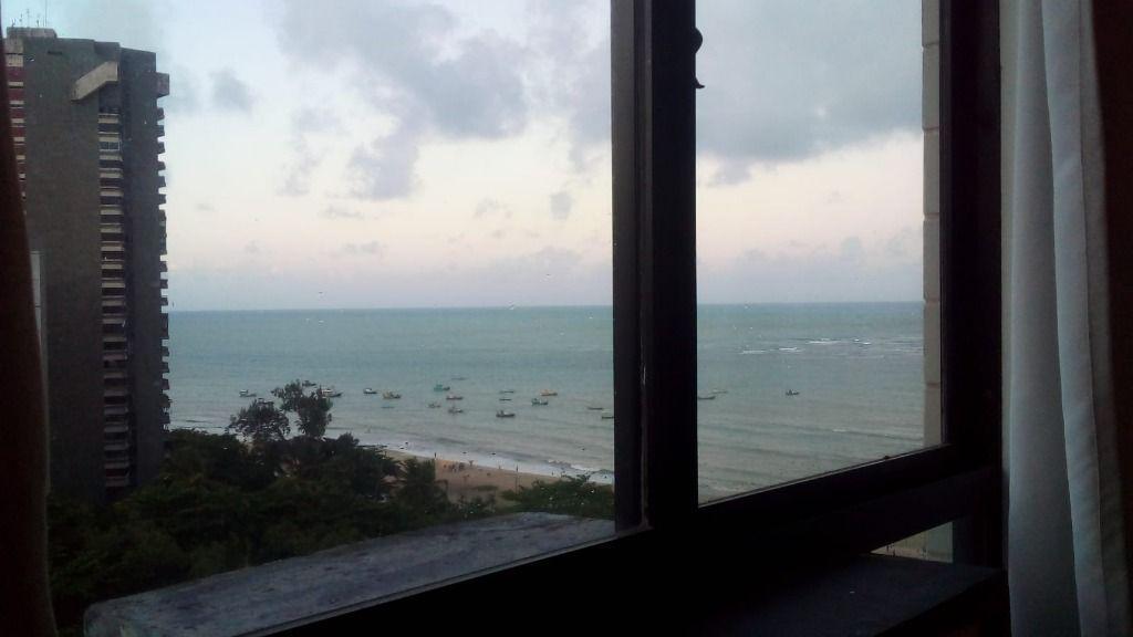 Flat mobililiado,35 m², vista para o mar, 1 vaga coberta, qto, wc social e cozinha com armários.