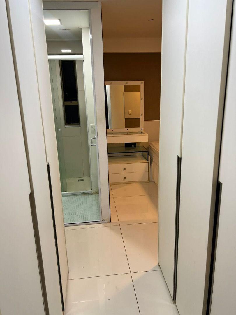 Apartamento possui armários planejados, no quarto, banheiro, cozinha e sala.