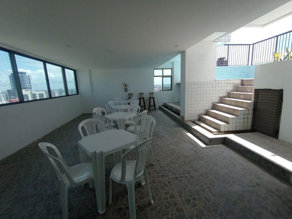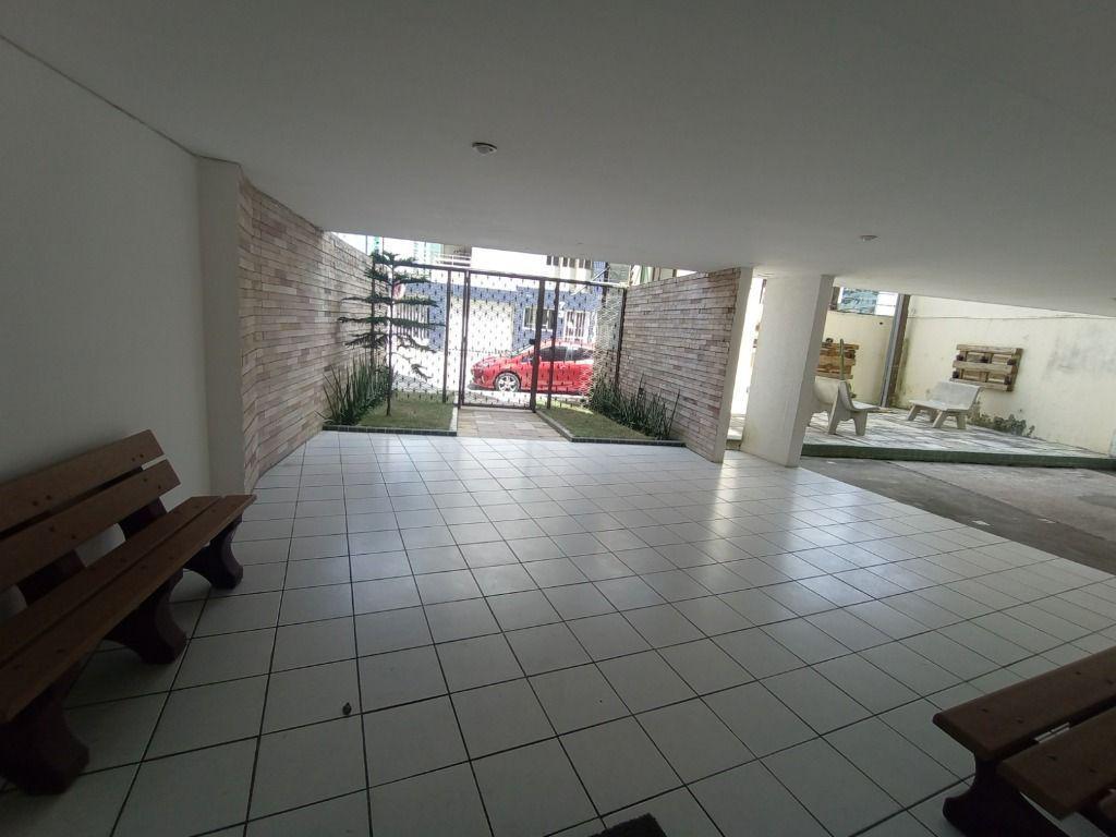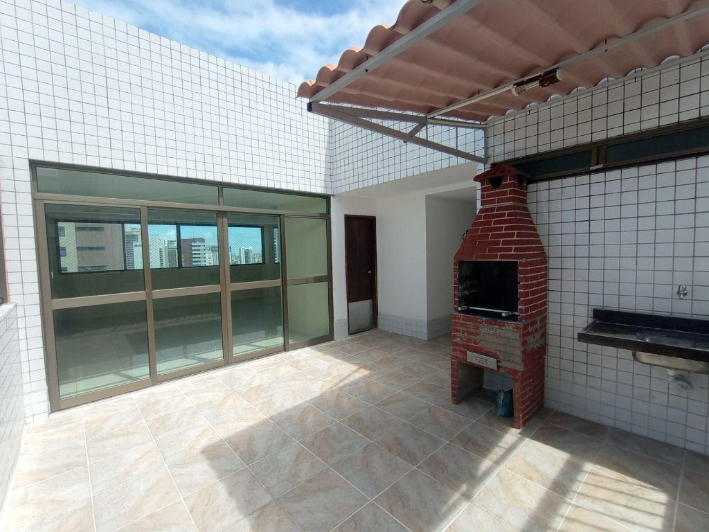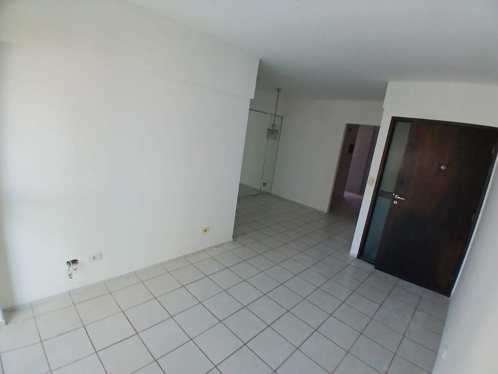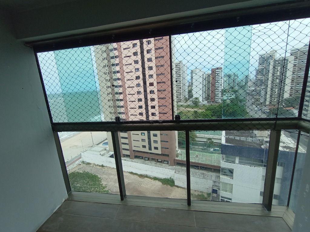 Apartamento com vista para o mar, 80 m², possui 3 quartos, sendo 1 suite, varanda, dependência completa e 2 vagas de garagem. Área de lazer oferece piscina, churrasqueira e salão de festas.